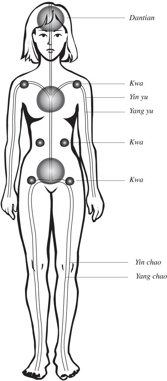 Contemporary Taoists adepts continue to teach that there are three dantians. In their system, the first dantian is situated in the center of the abdomen; the second dantian is located in the center of the chest, and the third dantian is located in the center of the head. However, after forty years of research, I’ve learned that Taoist anatomy is more complex and that there are seven dantians. In the revised system, the first dantian is located between the feet and is connected to two smaller cavities and the two energy gates located within the soles of the feet. The second dantian is located between the knees and is connected to two smaller cavities and the two energy gates located within the knees. The third dantian is located at the base of the spine and is connected to two smaller cavities and the energy gate located by the perineum. The fourth, fifth, and sixth dantians correspond to the abdominal, chest, and head dantians accepted by classical Taoism. The seventh dantian is located six centimeters above the head and is connected to two cavities and an additional energy gate (the fifteenth) above the head that supports it.